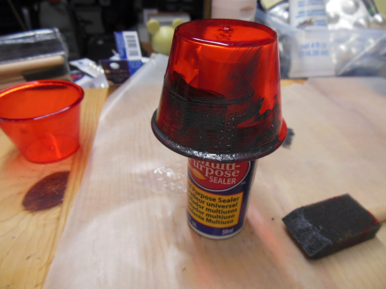 First off, you want to paint the lip and top 1/4 of the cup (inside and out) with a paint sealer/primer. Especially on plastic, you want your acrylic paint to adhere well. Once dry, paint with a dark color paint in those same areas. HINT: Use a foam brush in a dabbing motion as opposed to spreading it like normal paint. You will cover more surface with more paint and in less time.